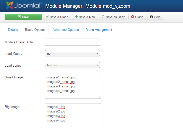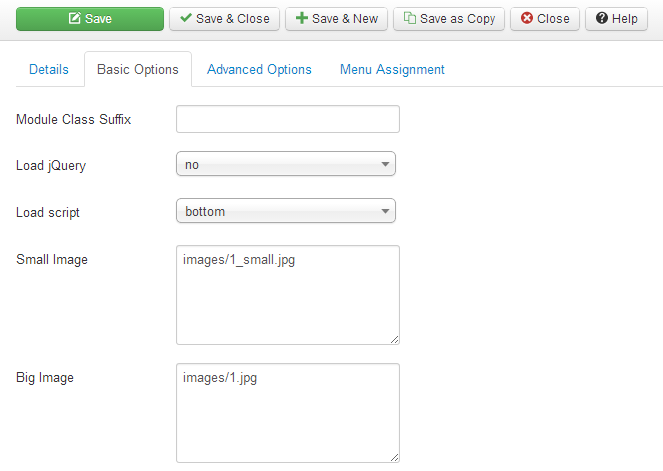 To show single image with zoom effect, Small Image and Big Image options should specify the location of small and big image respectively. The locations are relative, i. e. images/1.jpg indicates the image located in JOOMLA_DIR/images/1.jpg.